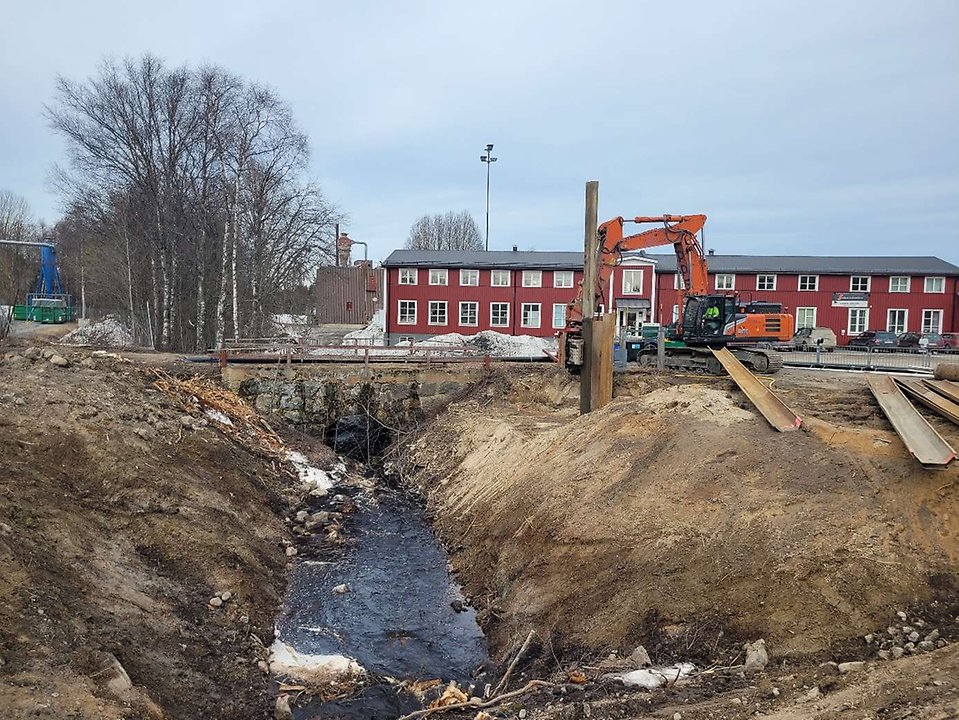 Arbeten med trumbyte i Öxbäcken är nu klart. Faunapassagen på plats och förberedelser för vatten och avlopp mot brandstationen påbörjas under veckan.