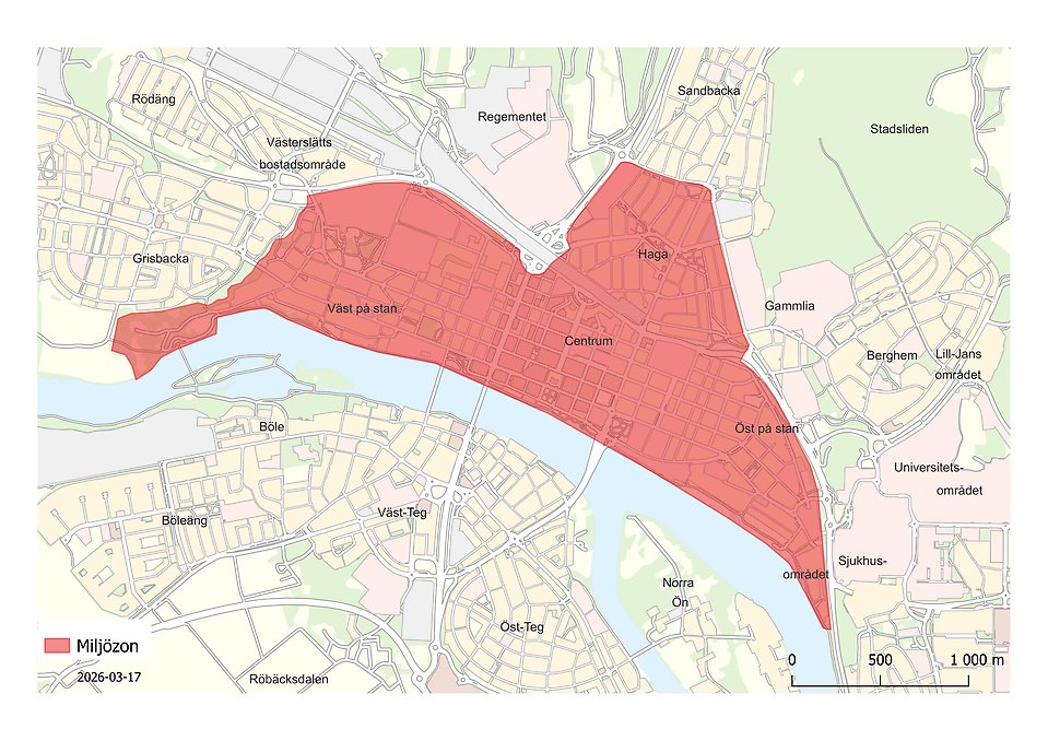 Området i centrala Umeå och nedre Hagaområdet enligt röd markering på kartbilden ovan omfattas av miljözon klass 1. Området avgränsas av Tvärån i väster, Umeälven i söder och östermalmsleden och Rothoffsvägen i öster samt Sandaparken i norr. Ytterhiskevägen, Anna Grönfeldts gata, Hagaesplanaden, Sandaparken, Rothoffsvägen, Östermalmsleden från korsningen med Rothoffsvägen och sydost samt Älvsvägen ingår inte i miljözonen.