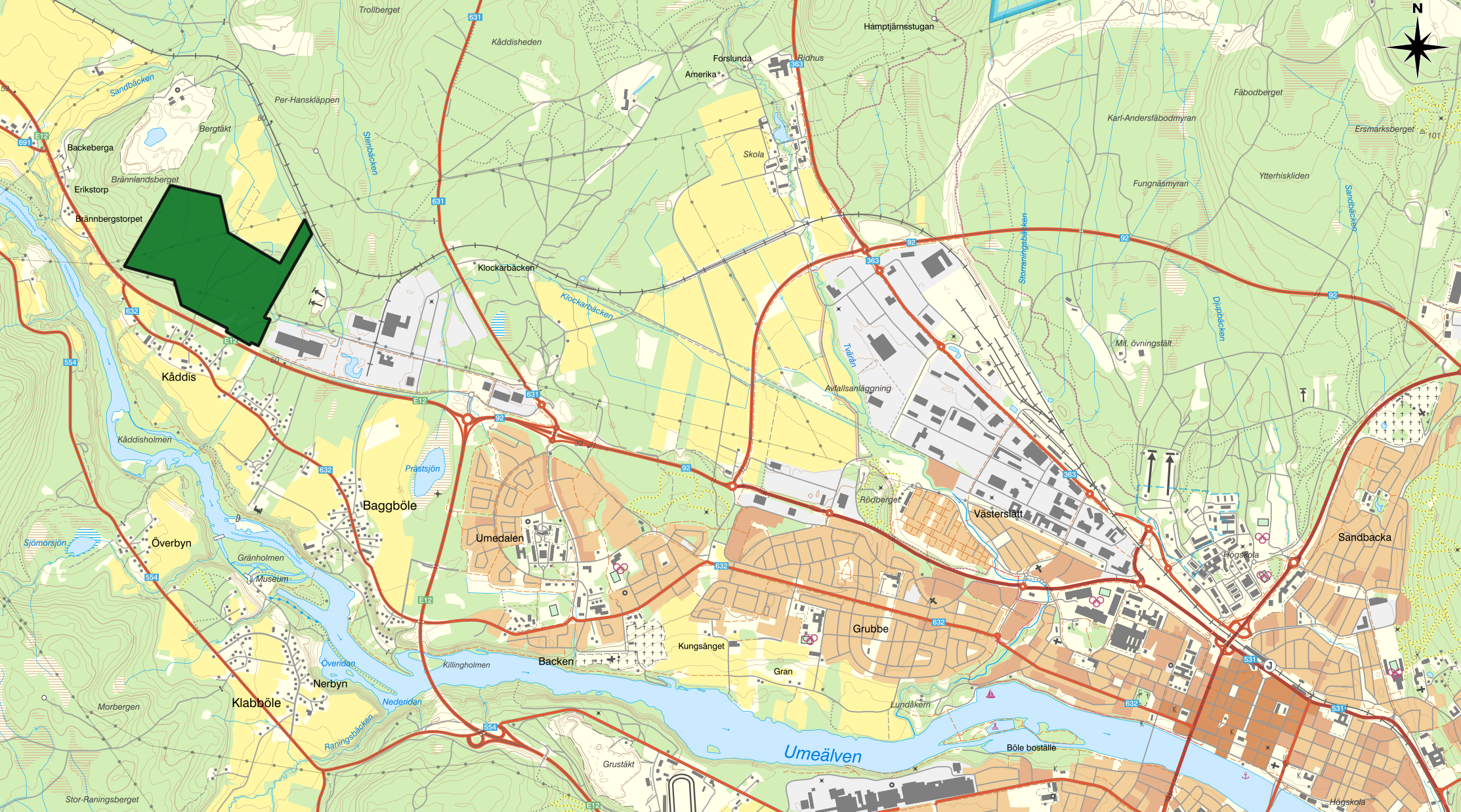 Klockarbäcken Brännlandsberget är beläget i nordvästra Umeå med direkt anslutning till väg E12. Området är en del av Umeås expansiva utvecklingszon och erbjuder ett strategiskt läge med smidig tillgång till Västra länken, E12 och järnvägsnätet.