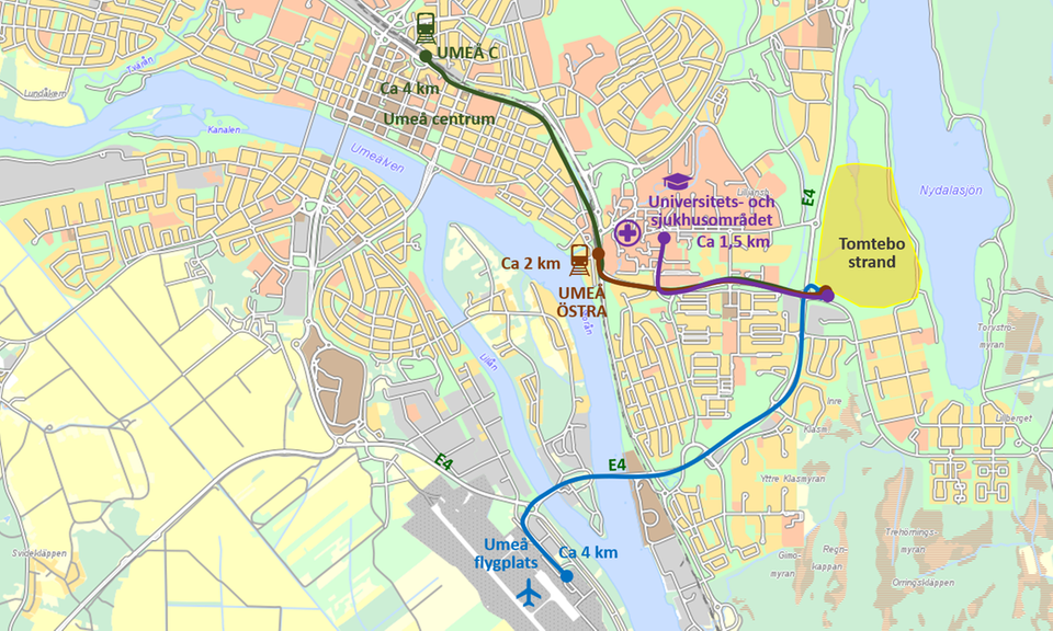 Tomtebo strand blir en ny stadsdel med en blandning av cirka 70 000 kvadratmeter verksamheter och cirka 3 000 bostäder. Tomtebo strand ligger mitt i naturen men också nära stora, dynamiska arbetsplatsområden, kommunikationer (Umeå östra, E4, flygplatsen) och centrum. Inom stadsdelen skapas förutsättningar för gemenskap, socialt ansvar, aktivitet, liv och rörelse och ambitionerna när det gäller social, ekonomisk och ekologisk hållbarhet är höga.