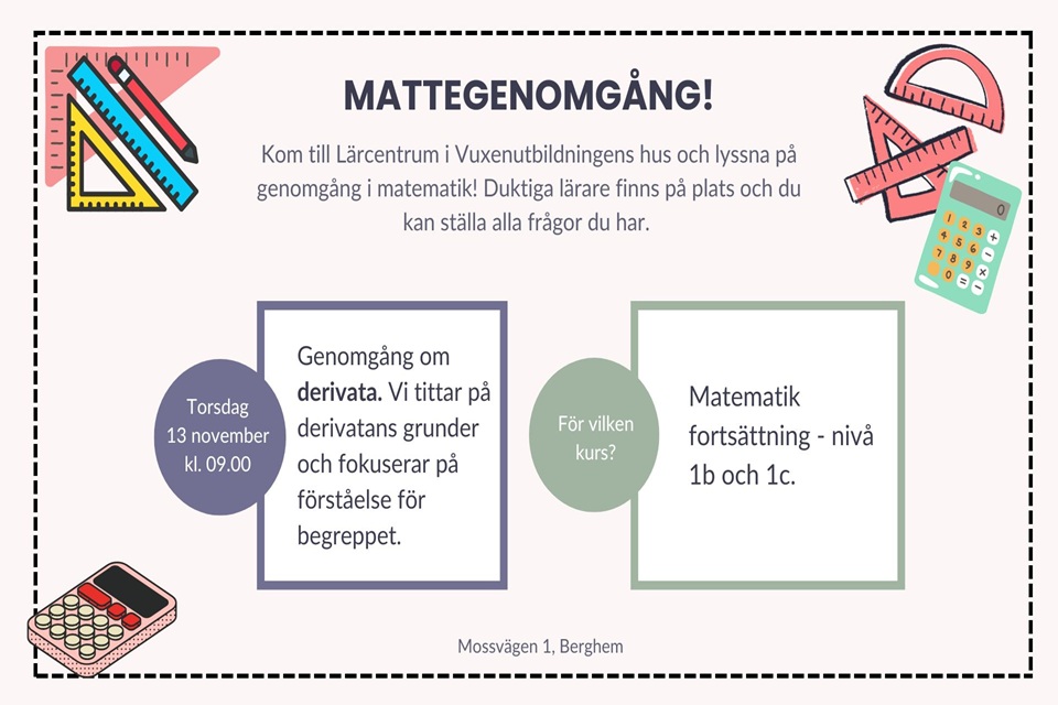Som vanligt är vi i Lärcentrum i Vuxenutbildningens hus, Mossvägen 1, klockan 09.00 torsdag den 13 november. Den här gången handlar det om derivata.