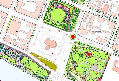 Kartan visar de grönytor som Umeå kommun ansvarar för. Här kan du titta på parkområden och dess innehåll, träd, buskar, typ av underlag och så vidare. Här hittar du även lekparker, papperskorgar och hundrastkärl.
