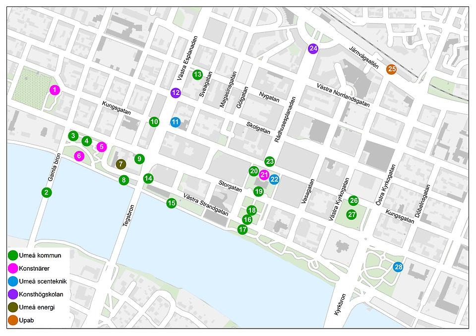 På olika platser intill Västra Esplanaden uoch under Tegsbron finns konstverk av studenter vid Konsthögskolan, Umeå Universitet.