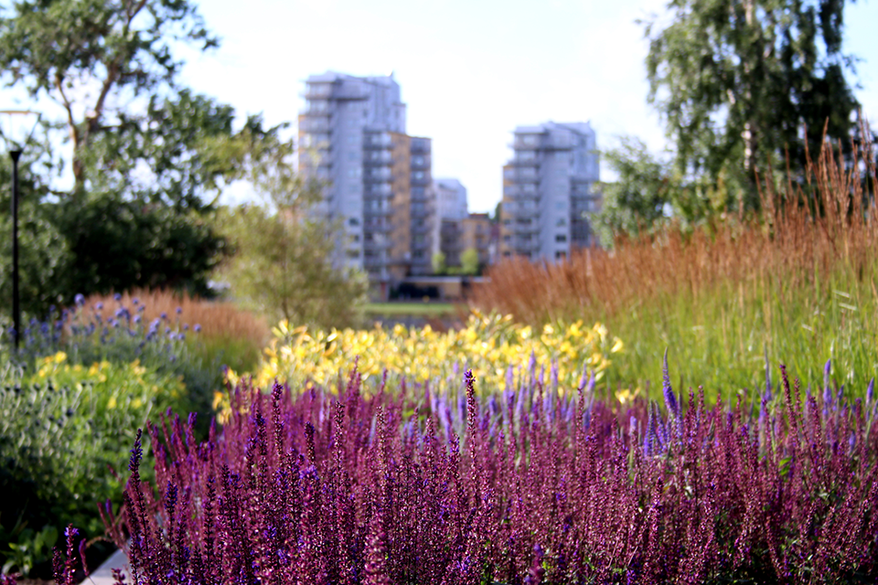 Planteringarna är uppbyggda av större fält med perenner och buskar med tydlig karaktär som kontrasterar mot varandra i höjd och karaktär. Se växtlista för Broparken under Mer information.