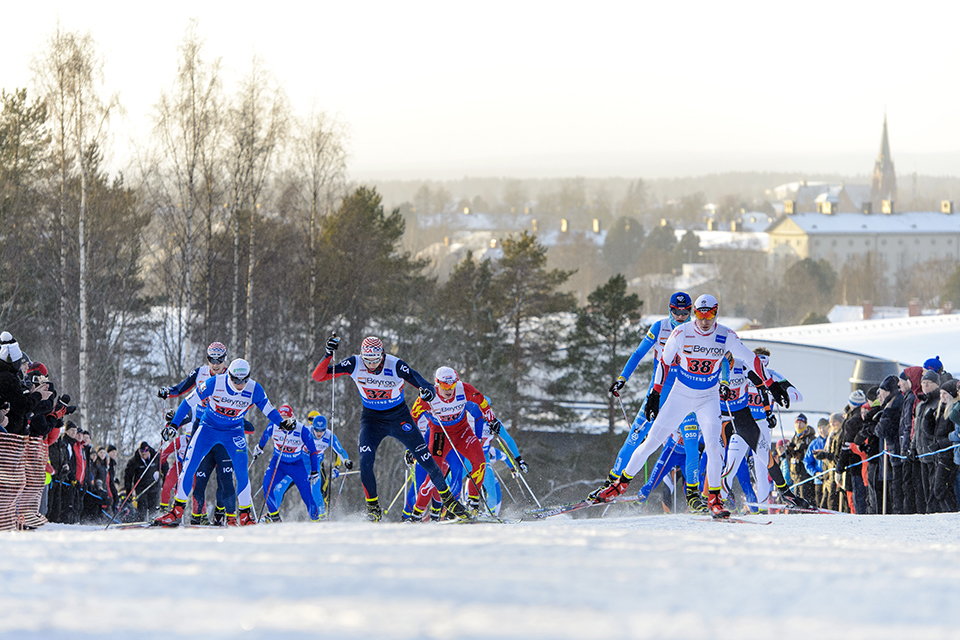 Förstaåkarna skidornas stafett tar sig upp för en backe under SM-veckan i Umeå 2014. Foto: Carl Sandin/Bildbyrån.