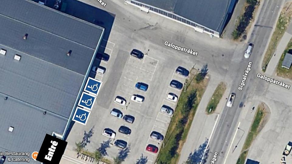 Ta av vid Signalvägen 3 och direkt vänster. Längs väggen mot entrén finns uppmärkta parkeringsplatser för rörelsehindrade, se kartbild nedan.