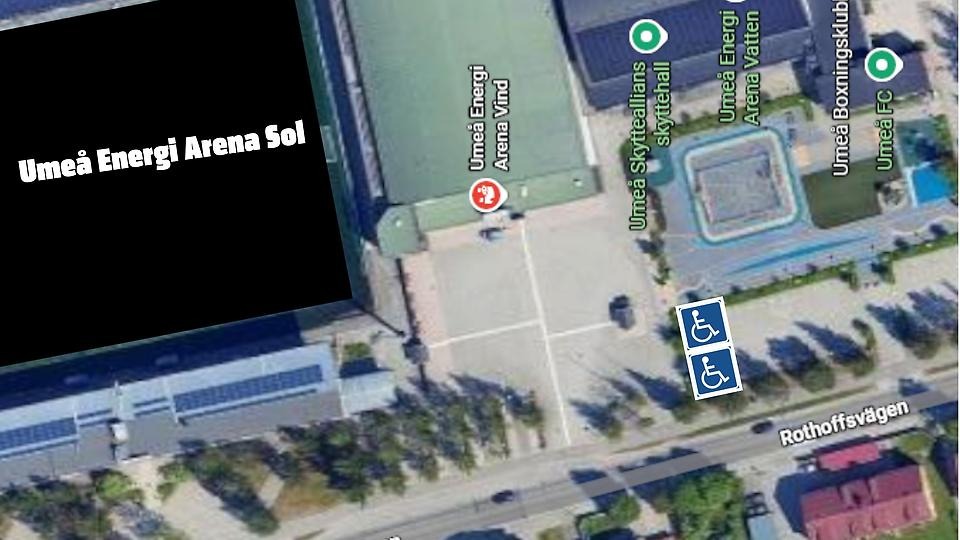 På parkeringen utanför Umeå Energi Arena Vind, nedanför Energiparken kommer det finnas sex tillfälligt utmärkta parkeringar för rörelsehindrade. Kör in från Rothoffsvägen för att hitta parkeringarna eller för att släppa av med färdtjänst. Det kommer att finnas en volontär på plats som sköter insläppet.